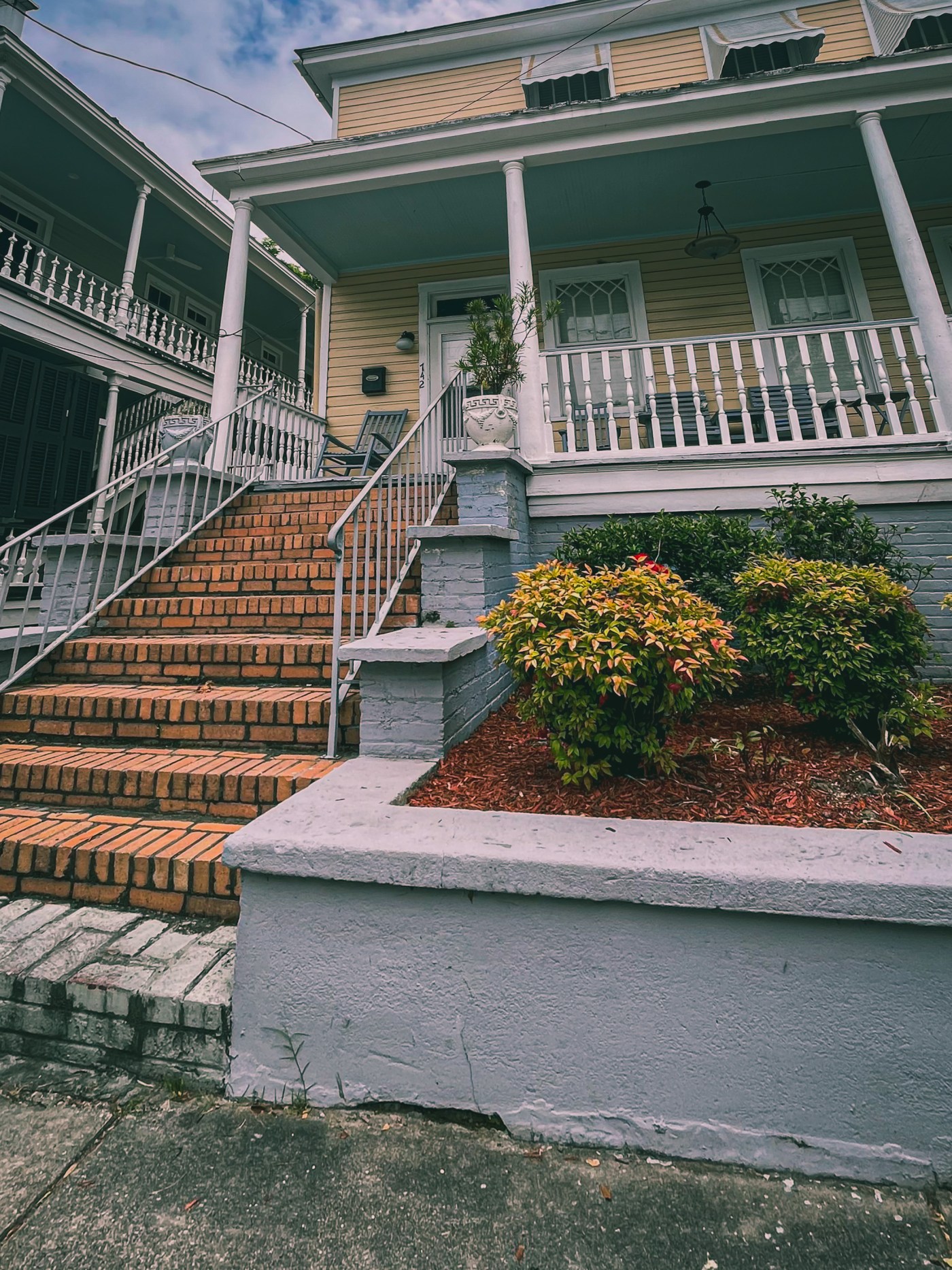 The painter in his whites alights from twisted six-speed bike to compliment the pine straw beds within the rusting iron fence.